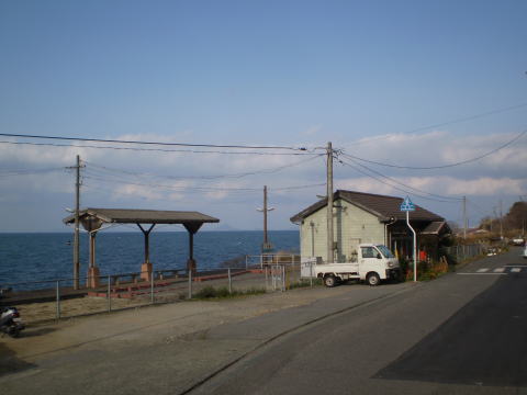 (写真) 下灘駅(右が駅舎、左がホーム)。 ホームの向こうが伊予灘